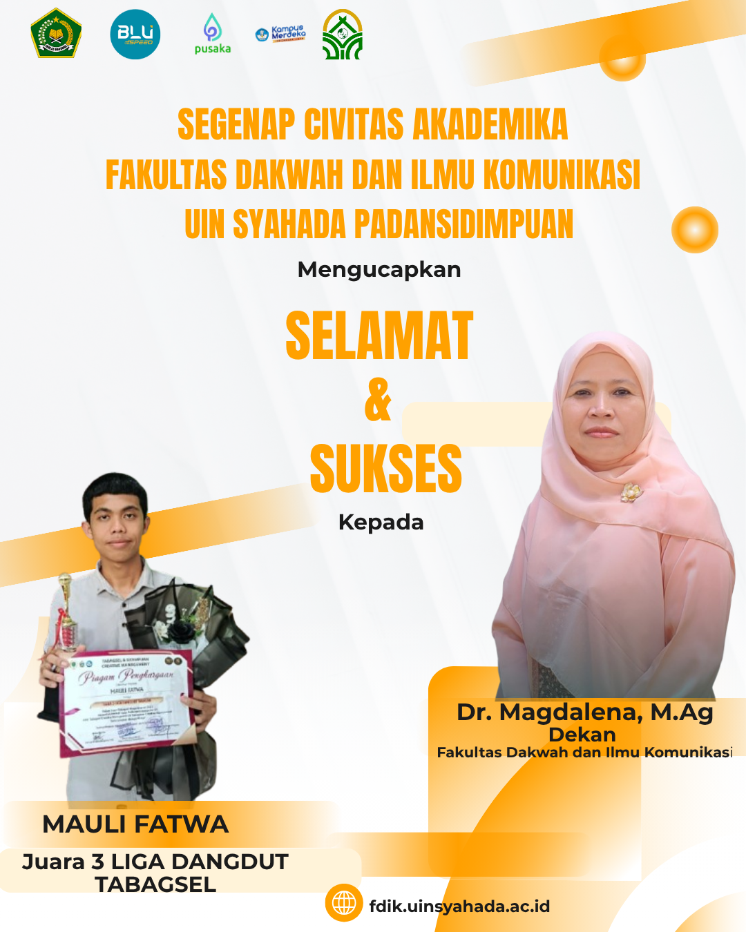 Padangsidimpuan, 04/11/2025 – Fakultas Dakwah dan Ilmu Komunikasi UIN Syahada Padangsidimpuan kembali menorehkan rasa bangga melalui prestasi salah satu mahasiswanya, Mauli Fatwa, dari Program Studi Manajemen Dakwah. Mahasiswa berbakat ini tampil sebagai peserta dalam ajang Lomba Liga Dangdut Tabagsel 2025 yang digelar pada 25–26 Oktober 2025 di Aula Kodim Padangsidimpuan, dengan mengusung tema “Satu Langkah Menuju Mimpi.”