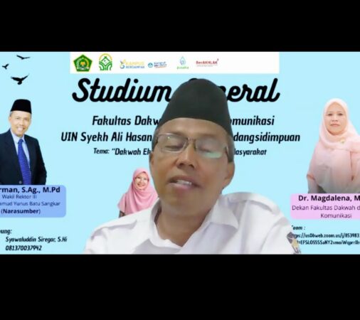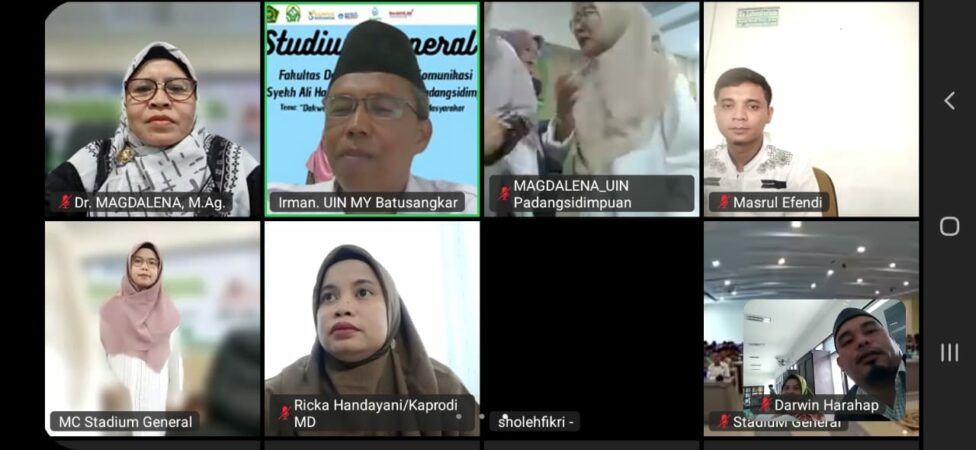 Padangsidimpuan, 25/11/2025. Fakultas Dakwah dan Ilmu Komunikasi (FDIK) UIN Syahada Padangsidimpuan sukses menyelenggarakan Studium General Tahun 2025 dengan tema “Dakwah Ekologi dalam Membangun Masyarakat Multikultural” pada Selasa, 25 November 2025. Kegiatan ini menghadirkan narasumber Dr. Irman, M.Pd, Wakil Rektor III UIN Mahmud Yunus Batu Sangkar, yang bergabung secara daring melalui Zoom Meeting.