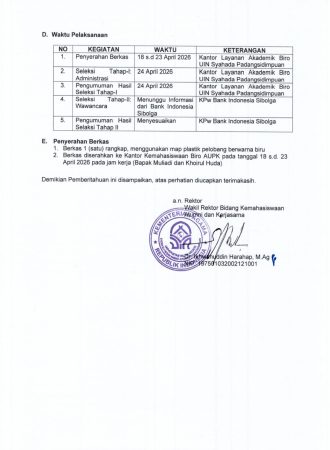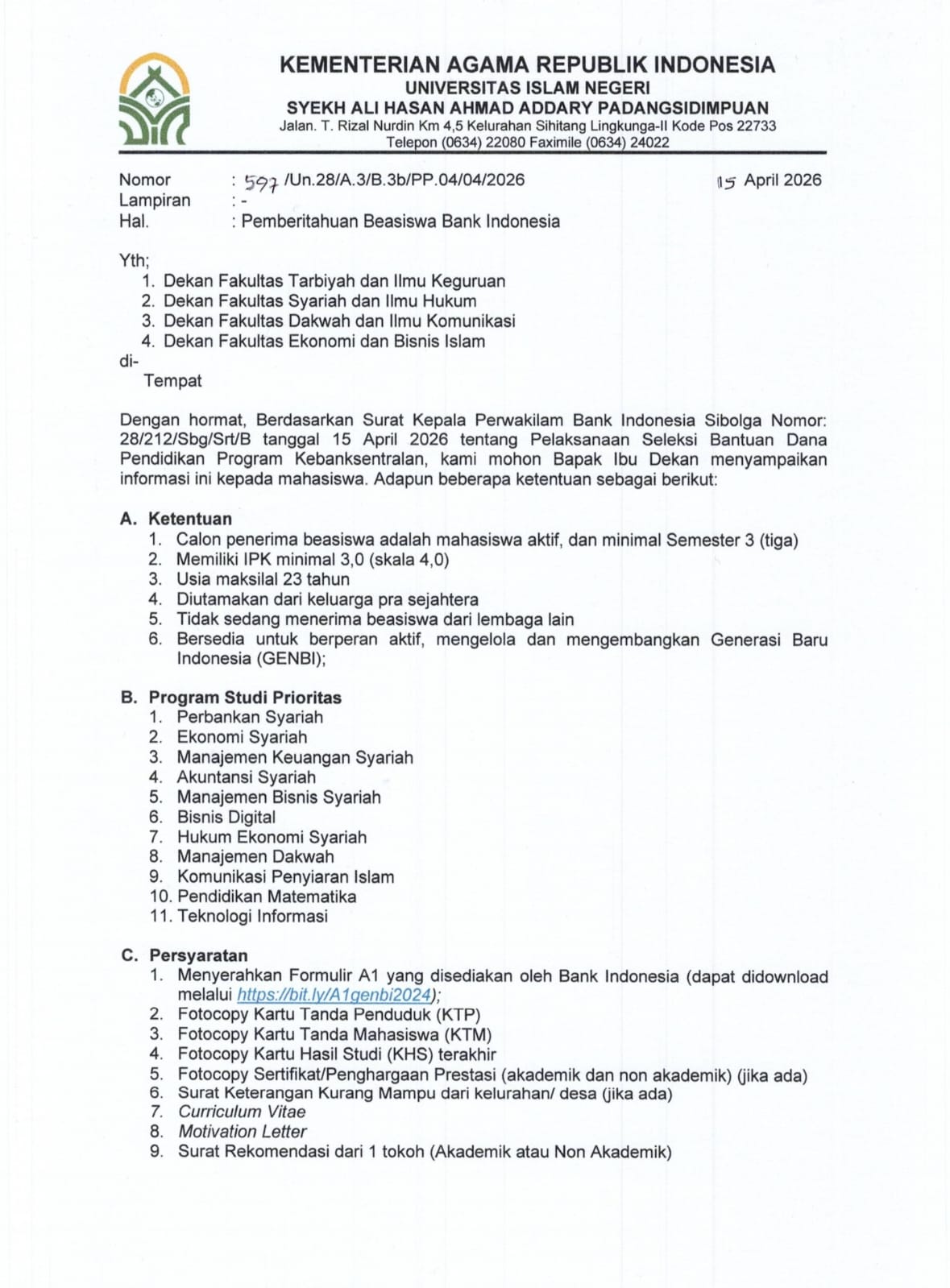 Padangsidimpuan, 15 April 2026 – Kementerian Agama Republik Indonesia melalui UIN Syekh Ali Hasan Ahmad Addary Padangsidimpuan resmi mengumumkan pembukaan seleksi Beasiswa Bank Indonesia (GENBI) tahun 2026. Informasi ini disampaikan berdasarkan surat dari Perwakilan Bank Indonesia Sibolga terkait pelaksanaan seleksi bantuan dana pendidikan Program Kebanksentralan.