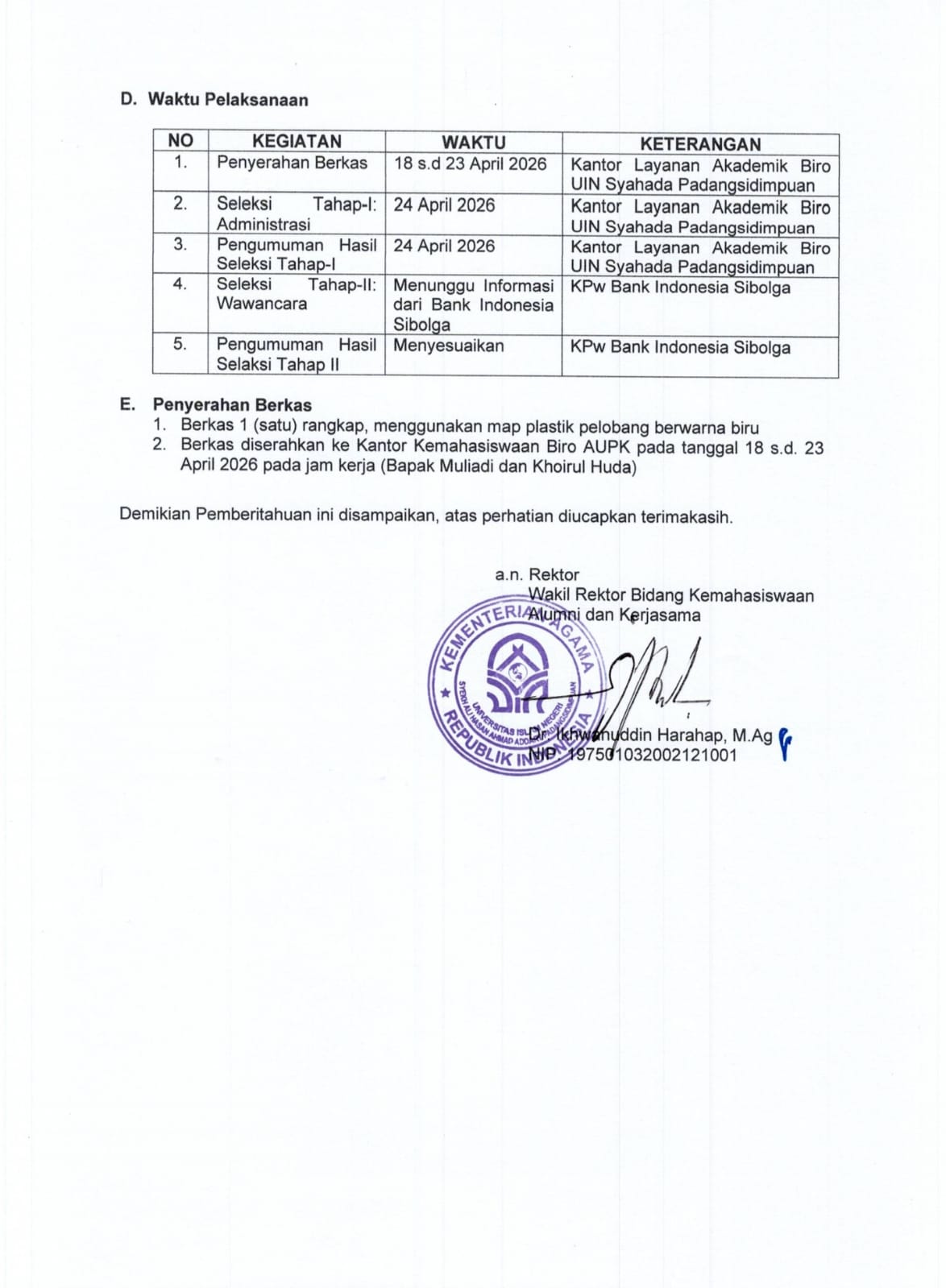Penyerahan berkas dilakukan di Kantor Kemahasiswaan Biro AUPK UIN Syahada Padangsidimpuan pada jam kerja.